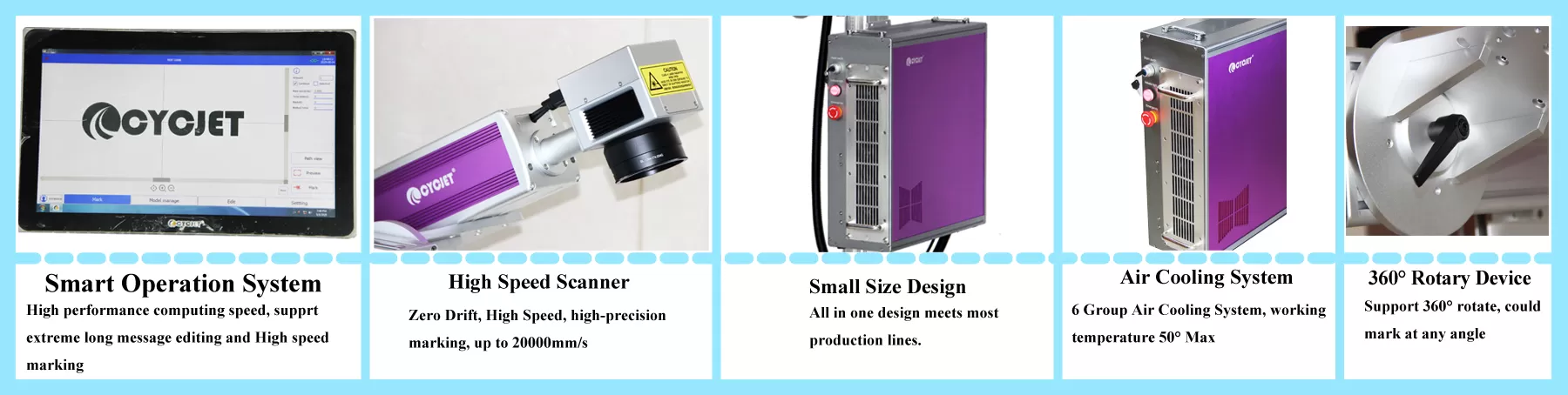 Лазерный маркировочный принтер серии CYCJET LF использует волоконные лазеры, разработанные нашей компанией самостоятельно, что обеспечивает более высокое соотношение цены и качества. Самая передовая поляризационная линзовая система гарантирует превосходное качество и высокую скорость маркировки. Вся лазерная система интегрирует цветной сенсорный контроллер, индукционную электрическую часть, энкодер и подъёмный кронштейн. Изощрённая и компактная конструкция позволяет легко устанавливать устройство в ограниченных пространствах.