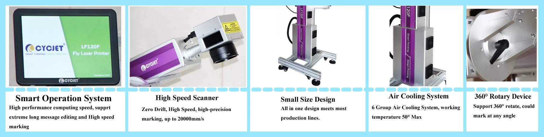 Лазерный маркировочный принтер серии CYCJET LF использует волоконные лазеры, разработанные нашей компанией самостоятельно, что обеспечивает более высокое соотношение цены и качества. Самая передовая поляризационная линзовая система гарантирует превосходное качество и высокую скорость маркировки. Вся лазерная система интегрирует цветной сенсорный контроллер, индукционную электрическую часть, энкодер и подъёмный кронштейн. Изощрённая и компактная конструкция позволяет легко устанавливать устройство в ограниченных пространствах.