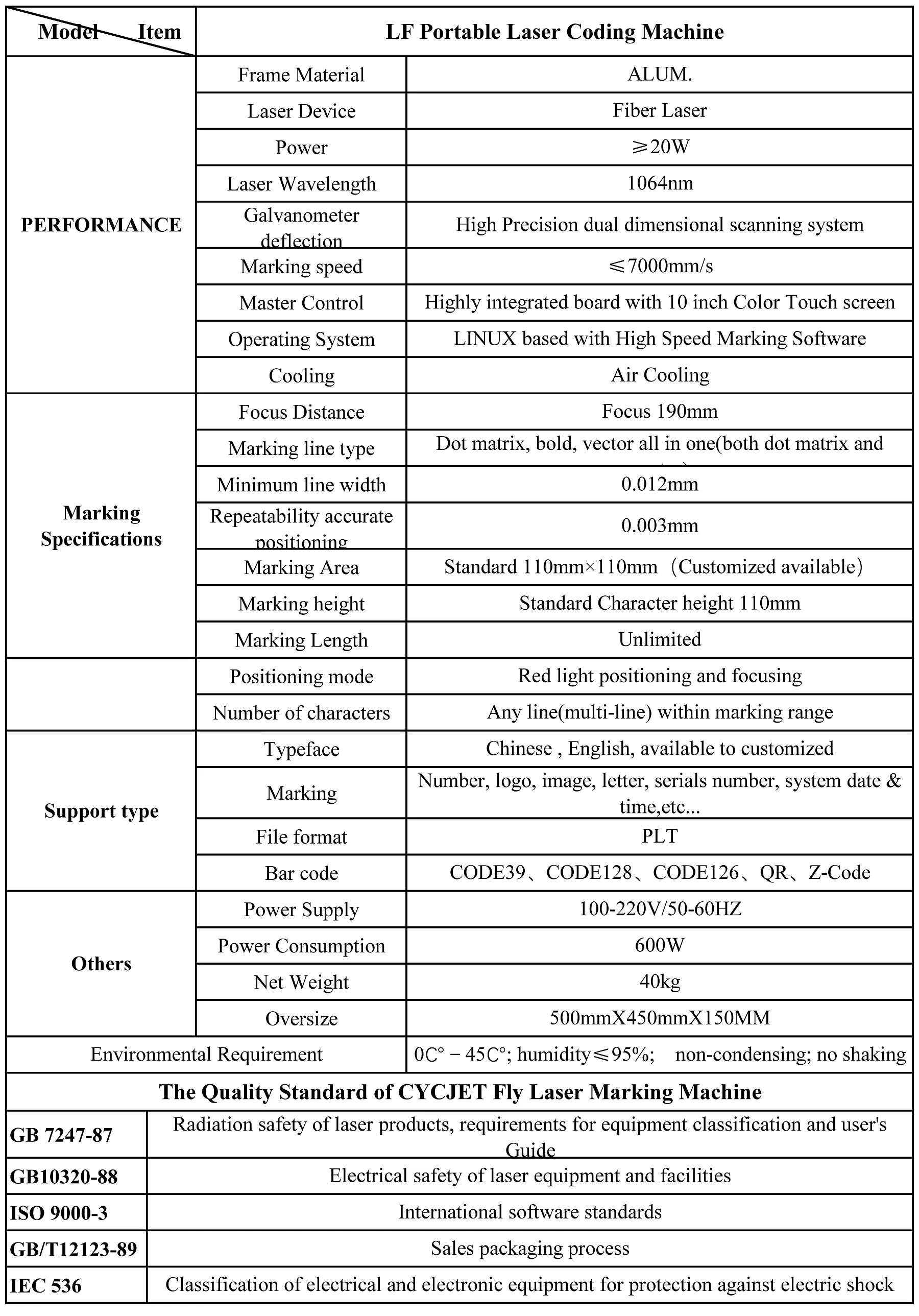 Технические характеристики настольной лазерной маркировочной машины CYCJET