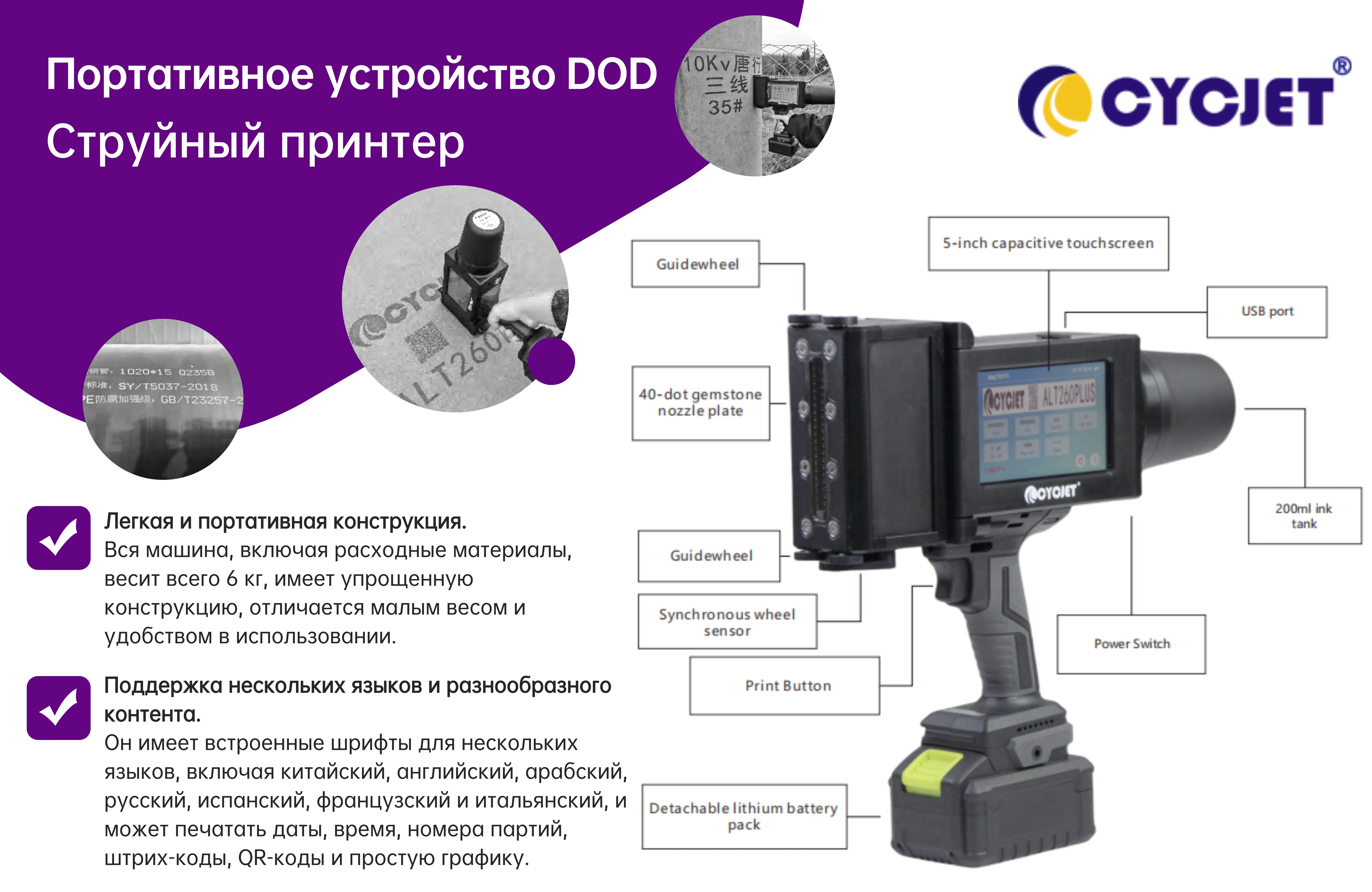 Ручной струйный принтер CYCJET ALT260Plus DOD, обладающий такими ключевыми характеристиками, как интеллектуальность, стабильность, гибкость и возможность индивидуальной настройки, предоставляет вам мобильное решение для маркировки, идеально адаптированное к вашим производственным потребностям.